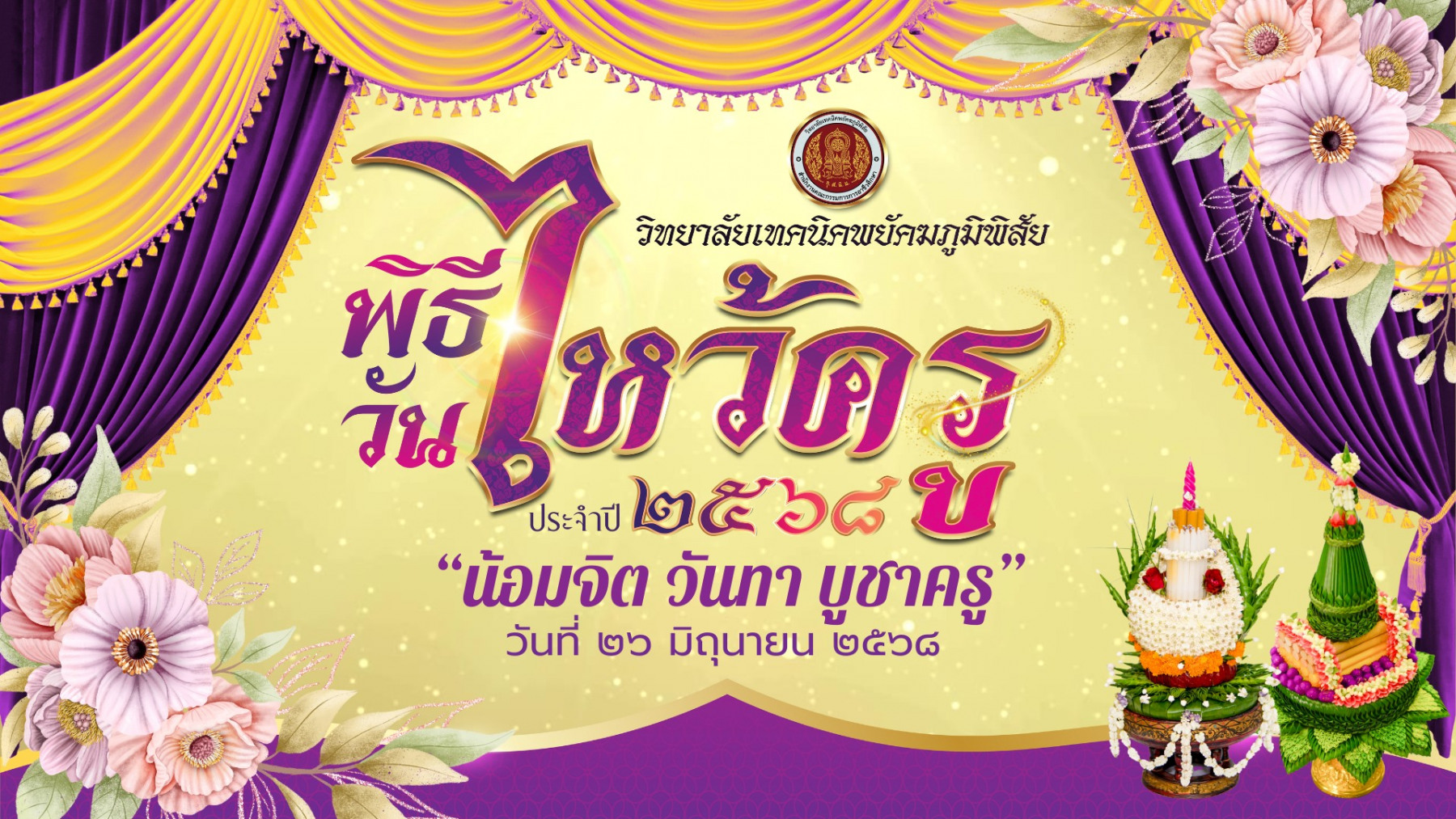 วิทยาลัยเทคนิคพยัคฆภูมิพิสัย ได้จัดกิจกรรมวันไหว้ครู ประจำปีการศึกษา 2568 ในวันที่ 26 มิถุนายน 2568 โดยมี นายวิชัย สังฆะมะณี ผู้อำนวยการวิทยาลัยเทคนิคพยัคฆภูมิพิสัย ประธานในพิธี โครงการวันไหวัครู ประจำปีการศึกษา 2568 จัดกิจกรรมพีธีบวงสรวงพระวิษณุกรรมและไหว้ครูช่าง และพิธีใหว้ครูประจำการ พร้อมมอบทุนการศึกษา ให้นักเรียน นักศึกษา