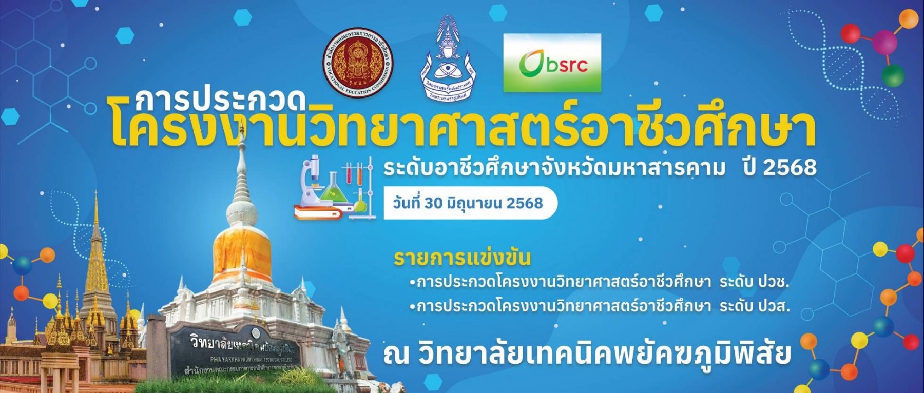สำนักงานอาชีวศึกษาจังหวัดมหาสารคาม จัดกิจกรรมประกวดโครงงานวิทยาศาสตร์อาชีวศึกษา ระดับอาชีวศึกษาจังหวัดมหาสารคาม ประจำปี พ.ศ. 2568 จัดโดยวิทยาลัยเทคนิคพยัคฆภูมิพิสัย ได้เป็นเจ้าภาพหลักในการจัดการประกวดโครงงานวิทยาศาสตร์อาชีวศึกษา และได้รับเกียรติจาก นายสัมฤทธิ์ หน่อแก้ว นายอำเภอพยัคฆภูมิพิสัย เป็นประธานพิธีเปิดการประกวดโครงงานวิทยาศาสตร์ฯ โดยมี นายวิชัย สังฆะมะณี ผู้อำนวยการวิทยาลัยเทคนิคพยัคฆภูมิพิสัย ประธานกรรมการดำเนินงานจัดการโครงงานวิทยาศาสตร์อาชีวศึกษา ระดับอาชีวศึกษาจังหวัดมหาสารคาม ในวันที่ 30 มิถุนายน 2568 ณ หอประชุมพระศรีสุวรรณวงศา วิทยาลัยเทคนิคพยัคฆภูมิพิสัย